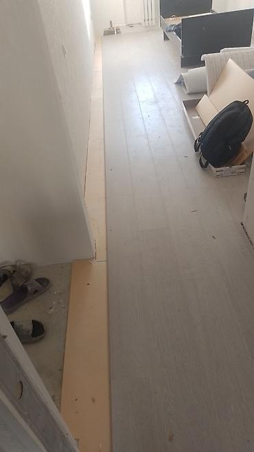 - Укладка ламината на подложку, ровная геометрия, аккуратные примыкания к стенам и перегородкам, подрезка по размеру.