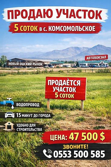 Продаётся земельный участок 5 соток в селе Комсомольское (район аэропорта Манас, близко к Бишкеку — около 15 минут до города).