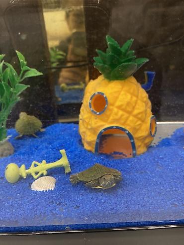 - Декорации: пластиковое растение на камне, домик-ананас с отверстиями для укрытия, ракушка, фигурка