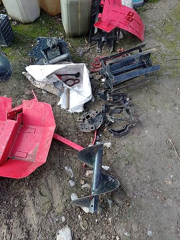 - Сменные насадки и комплектующие в наличии на фото: бур шнековый, металлические кронштейны и адаптеры, защитные кожухи/крылья, диски крепления, скобы, пружины и др.