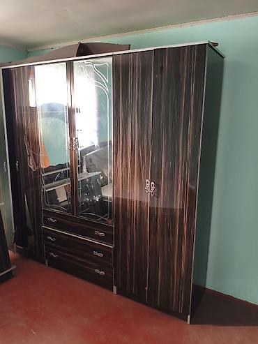 - Большой платяной шкаф: четырехдверный модуль с двумя зеркальными дверями по центру и двумя глухими боковыми; внизу — два выдвижных глубоких ящика. Подходит для хранения одежды на плечиках и белья.