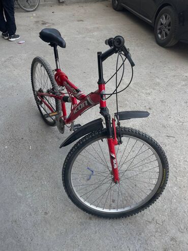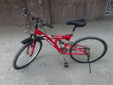 Горный велосипед с амортизацией (двухподвес) - Рама: складная/двухподвес, материал сталь/алюминий (по виду стальная), центральный амортизатор - Колеса: 26" - Вилка: амортизационная - Тормоза: обод...