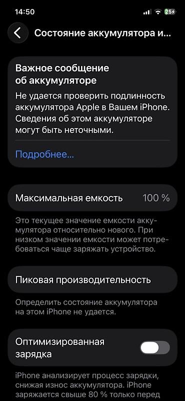 - В разделе «Состояние аккумулятора» отображается сообщение «Не удается проверить подлинность аккумулятора Apple». Максимальная емкость показывает 100%, «Пиковая производительность» — «Определить состояние не удается».