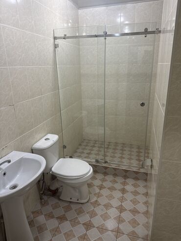 - Отделка: керамическая плитка на стенах и полу (светлая бежево-коричневая гамма), герметичные швы, потолочное освещение.