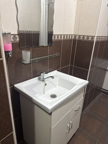 - Мебель и аксессуары: тумба с умывальником и встроенным шкафчиком, зеркало с полочкой, диспенсер для мыла, держатель для бумаги, корзинка для принадлежностей.