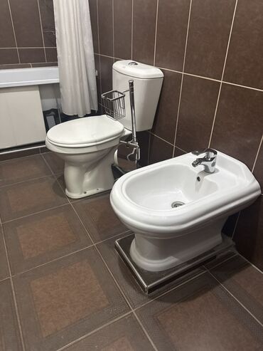 - Сантехника: унитазы с верхним бачком, биде, раковины — одна на пьедестале и одна в тумбе, смесители с душевой лейкой.