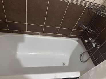 - Ванная: стандартная эмалированная чаша, настенный смеситель с душем, угловые металлические полки-органайзеры.