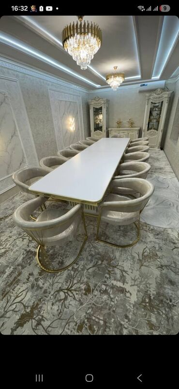 Столовый гарнитур в современном неоклассическом стиле: большой прямоугольный стол и комплект кресел.