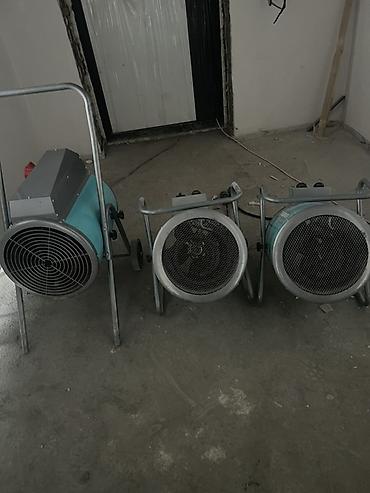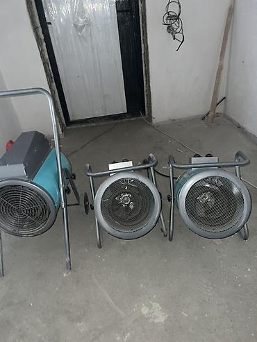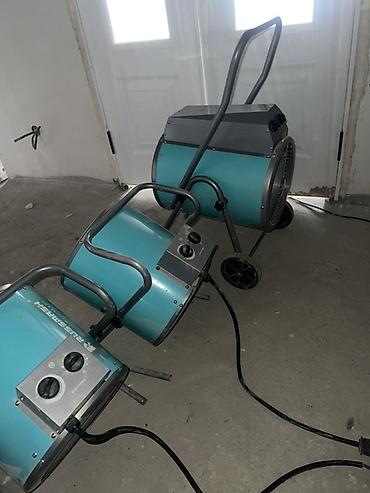 Промышленные тепловые пушки/электрические обогреватели, напольные, цилиндрические, бирюзовый корпус на металлических рамах. В комплекте три модели разного размера: две компактные переносные и одна увеличенная на тележке с колесами и ручкой для перемещения.