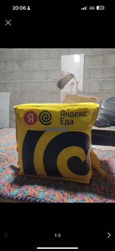 - Цвет и брендинг: желтый с черным спиральным узором и логотипом «Яндекс Еда».