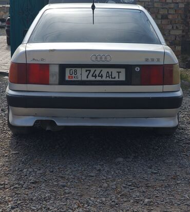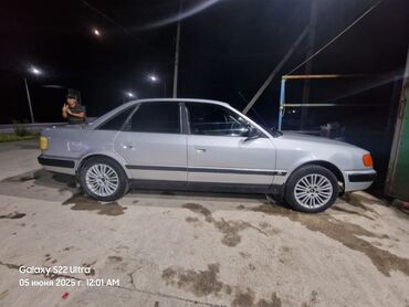 Audi 100 C4, седан, серебристый цвет. Бензиновый мотор 2.6 E (V6), задний шильдик “2.6 E”. Кузов с черными защитными молдингами по периметру и тонированными задними стеклами. Легкосплавные диски многоспицевые, низкопрофильные шины. Антенна на крыше, задний спойлер-юбка бампера, выхлоп с правой стороны. Оптика: передние прямоугольные фары с оранжевыми поворотниками, сзади – цельные фонари по ширине кормы. Салон темный, 5 дверей, электрические стеклоподъемники (по фото – кнопочные панели на дверях).