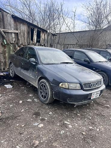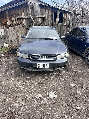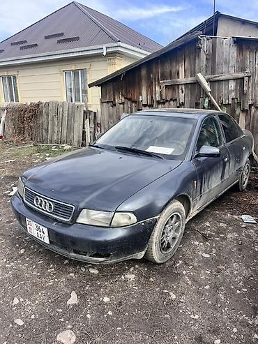 Audi A4 B5, седан, темно‑синий цвет. Передний привод. Кузов 4 двери, 5 мест. Легкосплавные диски, тонированные стекла. Оптика галогенная, противотуманные отверстия в бампере. Задняя эмблема «A4» и «1.8» (бензиновый мотор 1.8). Интерьер светлый. Номерные знаки KG.