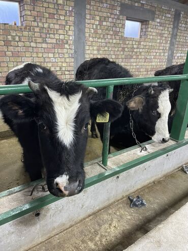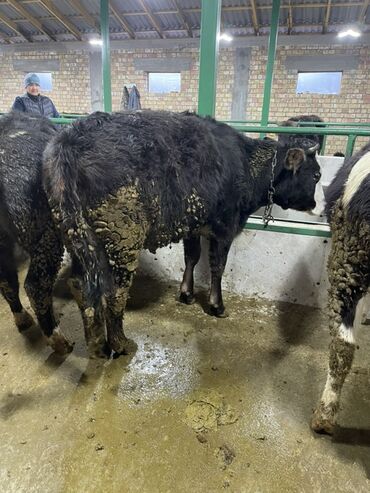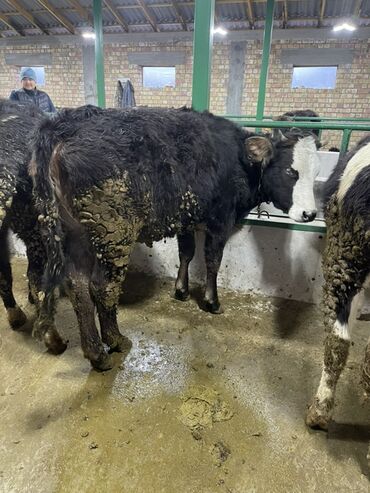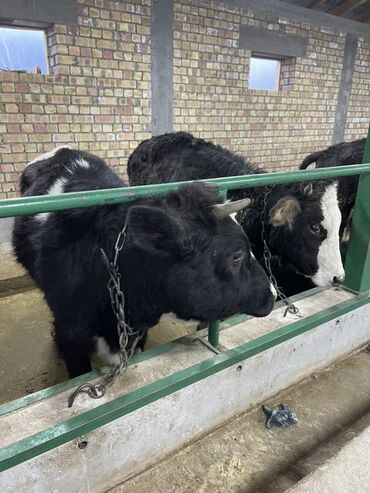 Продаются быки на откорм. - Порода/масть: черно-пестрые, один с белой «лысиной» и рогами. - Количество: 2 головы (на фото оба животных). - Содержание: стойловое, на привязи; кормление сеном и комб...