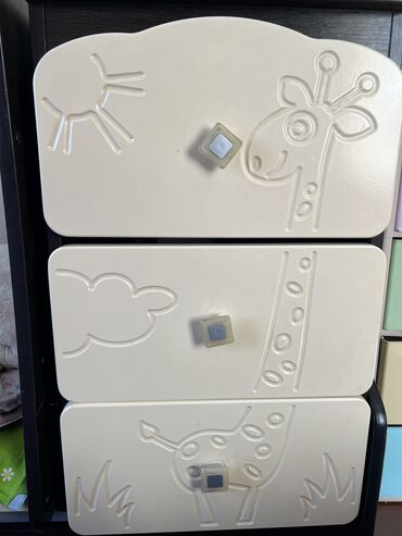 - Комод: три выдвижных ящика с рельефными детскими рисунками (жираф, облако, травка). Ручки квадратной формы.