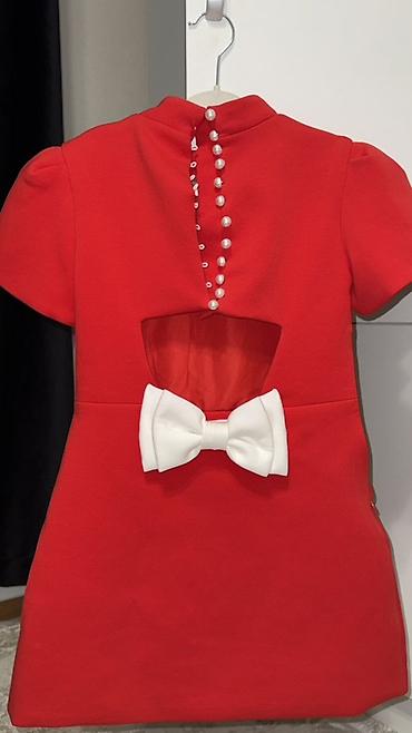 Праздничное детское платье, одевали один раз, на рост 130см - Цвет: белый, акцентные детали — красные пуговицы на спинке и фиксированный бант (по фото — на спинке в области талии). - Крой: А-силуэ...