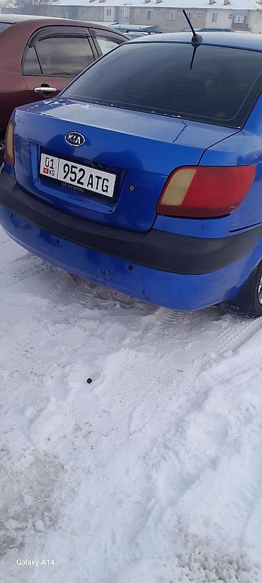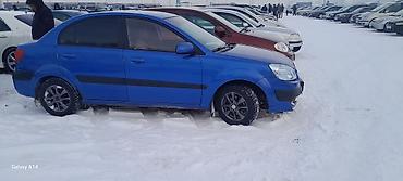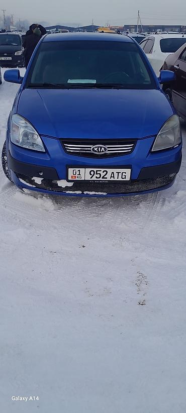 Kia Rio седан, синий цвет кузова. Компактный городской автомобиль с экономичным бензиновым двигателем и передним приводом.