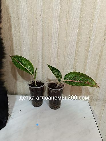 2) Детки аглаонемы — компактные черенки с пёстрыми зелёно-розовыми листьями. Теневыносливы, идеальны для комнат с рассеянным освещением. Требуют умеренного полива и рыхлого субстрата. Отлично приживаются и быстро дают новые листья. Цена: 200 сом за детку (указано на фото).