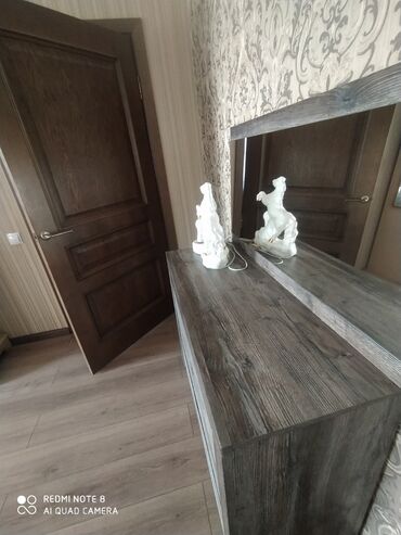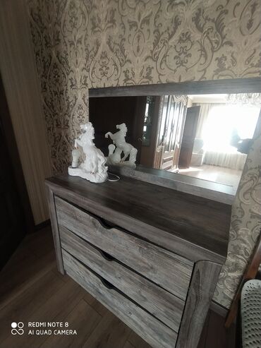 - Габариты (оценочно по фото): ширина ориентировочно 90–110 см, высота комода около 75–85 см; зеркало по ширине равно комоду, высота зеркала примерно 50–60 см.