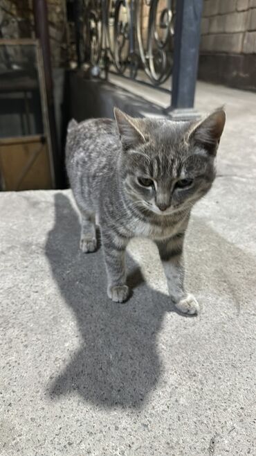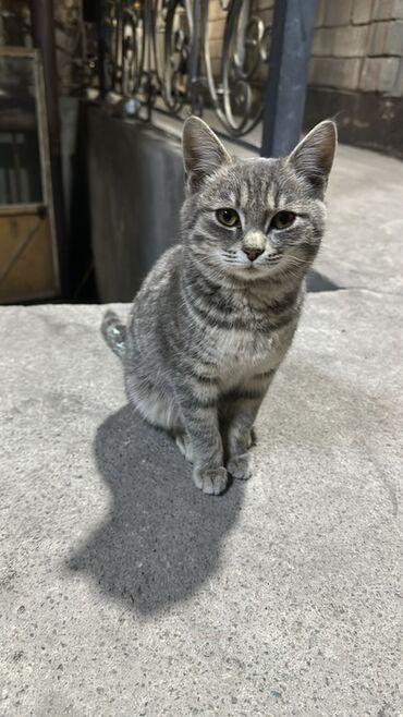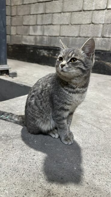 Котёнок, короткошёрстный, окраса серебристый табби (серые полосы и пятна). Компактный, пропорциональный корпус, аккуратные лапы, выразительные янтарные глаза, плотный плюшевый подшёрсток. Мордочка с чёткими «усами», хвост средней длины с кольцами.