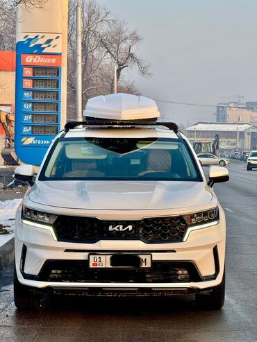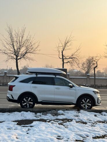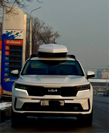 Kia Sorento г.в 2022 дизель об 2.2, сос отл. пробег 64000 км 7 месный (актуальное поколение), белый кроссовер с фирменной решёткой и LED-оптикой. Просторный салон с задним рядом на три места, комбинированная обивка: кожа и ткань с контрастной прострочкой, подлокотник, подстаканники в дверях, карманы на спинках, дефлекторы обдува и блок управления климатом/розетки для второго ряда. На крыше установлены поперечины и аэродинамический багажный бокс (жёсткий, вытянутый, крышка белая) для дополнительного объёма перевозки – удобно для поездок и зимнего снаряжения. Дизайнерские легкосплавные диски, тонированные стекла, рейлинги. Современные дневные ходовые огни, парковые огни и противотуманные фары в бампере. Номерной знак KG. Отличный семейный SUV с большим багажным пространством и готовой системой для перевозки груза на крыше.