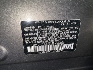 - Ванс (наклейка на стойке) с данными: производство Subaru Corporation, дата 10/2020; рекомендованные шины 225/60 R17 99H на дисках 17x7J (давление 33 psi спереди, 32 psi сзади).
