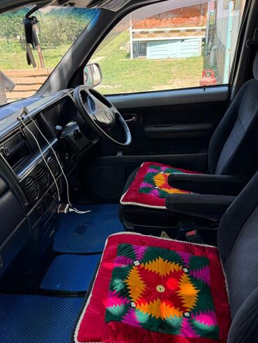 - Интерьер: тканевый салон темного цвета, передние раздельные сиденья с подлокотниками, декоративные подушки-накидки, синие резиновые коврики.