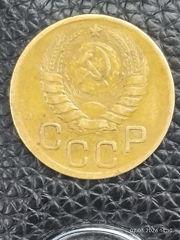3 копейки СССР, 1950 год - Номинал: 3 копейки - Год выпуска: 1950 - Страна: СССР - Материал: латунь (медно-цинковый сплав) - Диаметр: около 22 мм - Аверс: герб СССР с колосьями и лентами, внизу на...