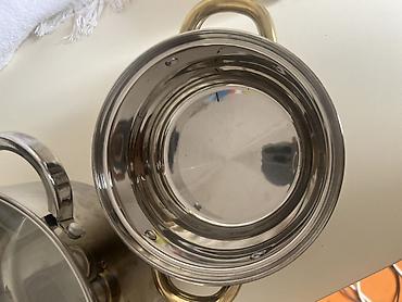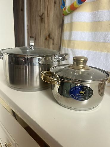 - Средняя кастрюля Berghoff (Germany): полированная нержавеющая сталь, золотистые ручки, стеклянная крышка с металлической ручкой и пароотводом. Универсальна для гарниров, соусов, тушения.