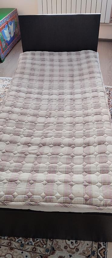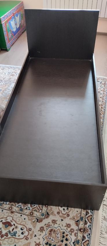Односпальная кровать с высоким изголовьем, темный цвет (под венге/шоколад). Корпус прямоугольный, с бортами по периметру, рассчитан на матрас стандартной односпальной ширины. Основание сплошное, без ламелей — матрас лежит ровно и не проваливается. Простая лаконичная конструкция подходит для детской, гостевой или малогабаритной комнаты. На фото показана установка матраса сверху (матрас входит в комплект, если указан на фото). Дизайн нейтральный, легко сочетается с любой мебелью. Размер ориентировочно под матрас около 80–90 см шириной и 190–200 см длиной.