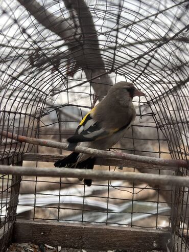 Щегол (Carduelis carduelis) в клетке. Описание: - Яркое оперение: красная «маска» на голове, контрастные черно-белые крылья с насыщенными жёлтыми «зеркалами», серо-оливковая спина. - Певчая птица ...