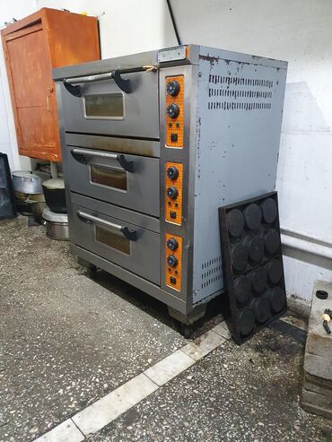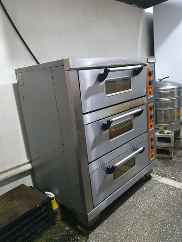 Габариты по фото — формат «полупромышленный/промышленный» с тремя полками, рассчитан на одновременную загрузку нескольких противней в каждом ярусе. Подходит для интенсивной эксплуатации и гибкой организации выпечки благодаря независимому управлению каждым уровнем.