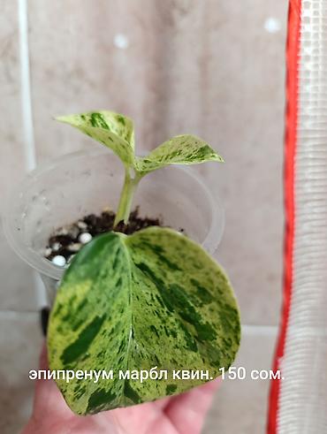 - Эпипремнум Marble Queen — пестролистный черенок с мраморным рисунком. Неприхотлив, хорошо растёт в подвесах и на опоре, переносит полутень. Цена на фото: 150 сом.