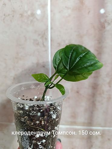 - Клеродендрум Томпсона — укоренённый черенок лианы с глянцевыми листьями. Для цветения требуется яркий свет, регулярная обрезка и опора. Цена на фото: 150 сом.