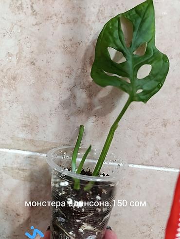 - Монстера Адансона — укоренённый черенок с характерными прорезными листьями. Подходит для вертикальной опоры/мха-палки, любит яркий рассеянный свет и умеренный полив. Цена на фото: 150 сом.