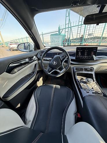 - Интерьер (видно через стекла): светлый салон, мультируль, крупный центральный дисплей мультимедии, передние сиденья с выраженной боковой поддержкой.