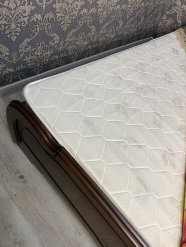 Деревянная двуспальная кровать с изголовьем + матрас - Классическое резное изголовье из массива/шпона тёмного оттенка, с декоративными элементами. - Основание кровати на прочной раме, низкая посад...
