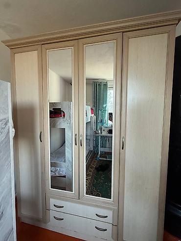 - Шкаф платяной 5‑дверный: две центральные двери с зеркалами в полный рост, по бокам глухие створки. Внизу — два выдвижных ящика. Внутри отделения для вешалок и полки (по конструкции).