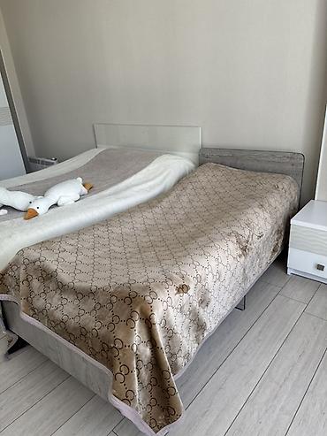 - Односпальная кровать с прямоугольным изголовьем в том же декоре под дерево. Основание на ножках, высота удобна для уборки и доступа к постельным принадлежностям.