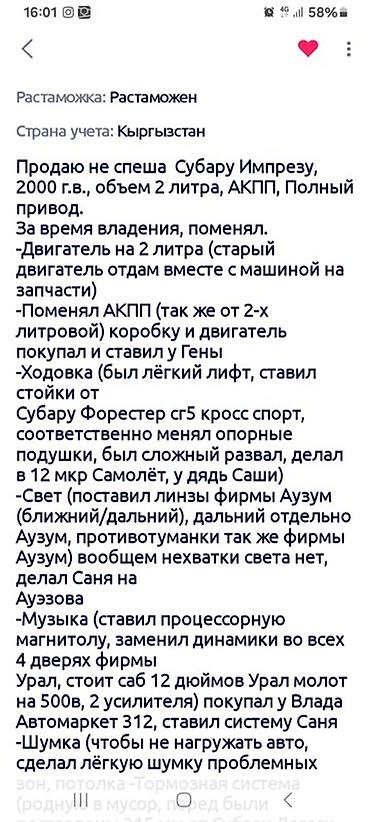 Subaru Impreza (кузов универсал), серебристый цвет. Субару импреза обьем 2 куба мотор коробка подвески от Субару сг5. Состояние отличное . Вложения по кузову касметика.