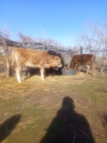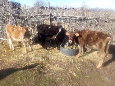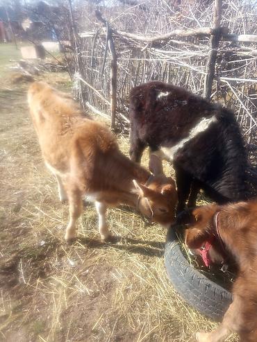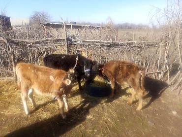 - Порода/масть: рыжий теленок с густой шерстью (на фото), рядом черный одновозрастный теленок у кормушки.