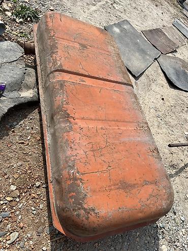 Металлический топливный бак (вероятно от грузового автомобиля/техники). Описание: - Материал: сталь, толстостенный. - Форма: прямоугольная, с округлыми краями. - Заливная горловина с металлической...