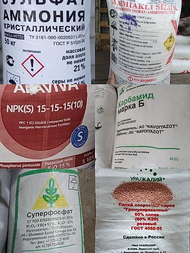 Жер семирткичтер. Минеральные удобрения в мешках по 50 кг 1) Аммофос (азотно-фосфорное удобрение) - Маркировка: N – 10±1%, P2O5 – ≥46% 2) Калий хлористый «Уралкалий». 3) Диаммофоска APAVIVA (ФосА...