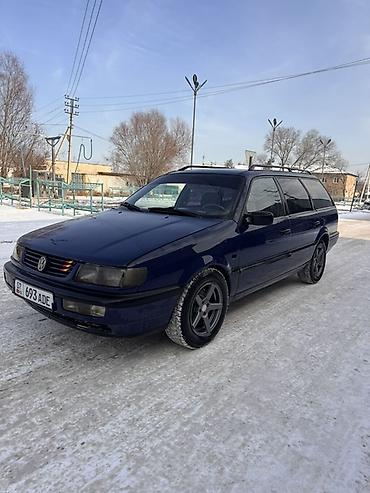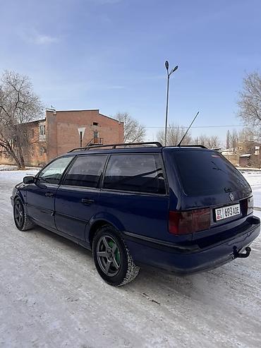 Volkswagen Passat Variant (B4) универсал, темно‑синий цвет кузова. Практичный семейный формат с большим багажным отсеком и рейлингами на крыше для крепления бокса/багажника.
