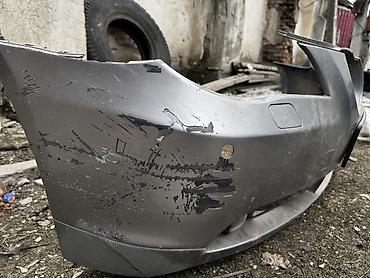 Передний бампер для автомобиля. Пластик, с местом под номерной знак и прямоугольными проёмами под ПТФ/воздухозаборники. Имеются штатные крепления, внутренняя часть с ребрами жесткости. На поверхнос...