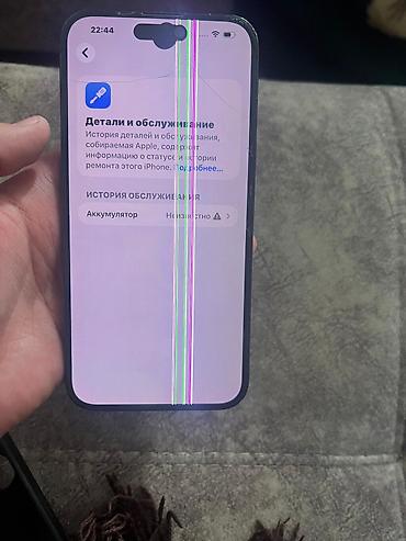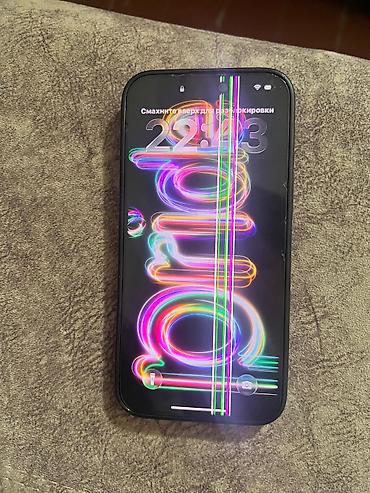 - Экран 6.7", OLED Super Retina XDR, Dynamic Island. На дисплее видны вертикальные цветные линии — требуется замена/ремонт экрана. Сенсор и разблокировка работают.