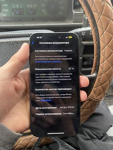 - Батарея: состояние «Нормальная», максимальная ёмкость 87%; дата изготовления аккумулятора — август 2023 г., первое использование — сентябрь 2023 г.