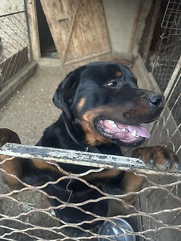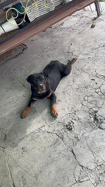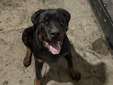 Ротвейлер, кобель. Крепкий, мощный корпус, широкая грудь, крупная голова, правильный прикус, выраженные подпалины. Густая короткая шерсть чёрного окраса с рыжими отметинами. Уравновешенный темперамент, внимательный и контактный, хорошо мотивируется лакомством и игрушками. Подходит для охраны частной территории и как компаньон при достаточной физической нагрузке.