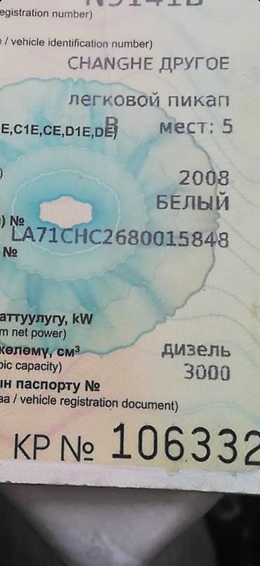 Продаю на ходу Сатылат мотор коробка мерс журот Changhe, легковой пикап, 2008 г., белый. Дизель 2,5. По техпаспорту: 5 мест, VIN LA71CHC8.270мин Кеми бар, вариант каралат