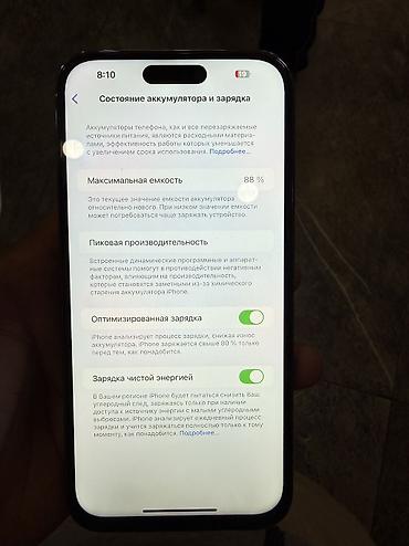 IPhone с OLED‑дисплеем , Face ID и вырезом Dynamic Island. На экране видно: раздел “Состояние аккумулятора и зарядка” с максимальной ёмкостью 80% и включённой функцией “Оптимизированная зарядка”. П...