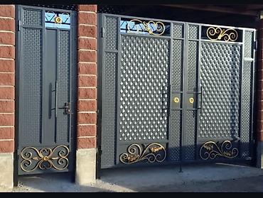 - Ворота и калитки: распашные секции из стали с декоративной ковкой, ромбическим тиснением полотен и акцентами золотистого цвета. Усиленная рама, вертикальные петли, предусмотрены ручки и места под замки/автоматику. Возможна интеграция калитки, верхние элементы с фигурными вставками.
